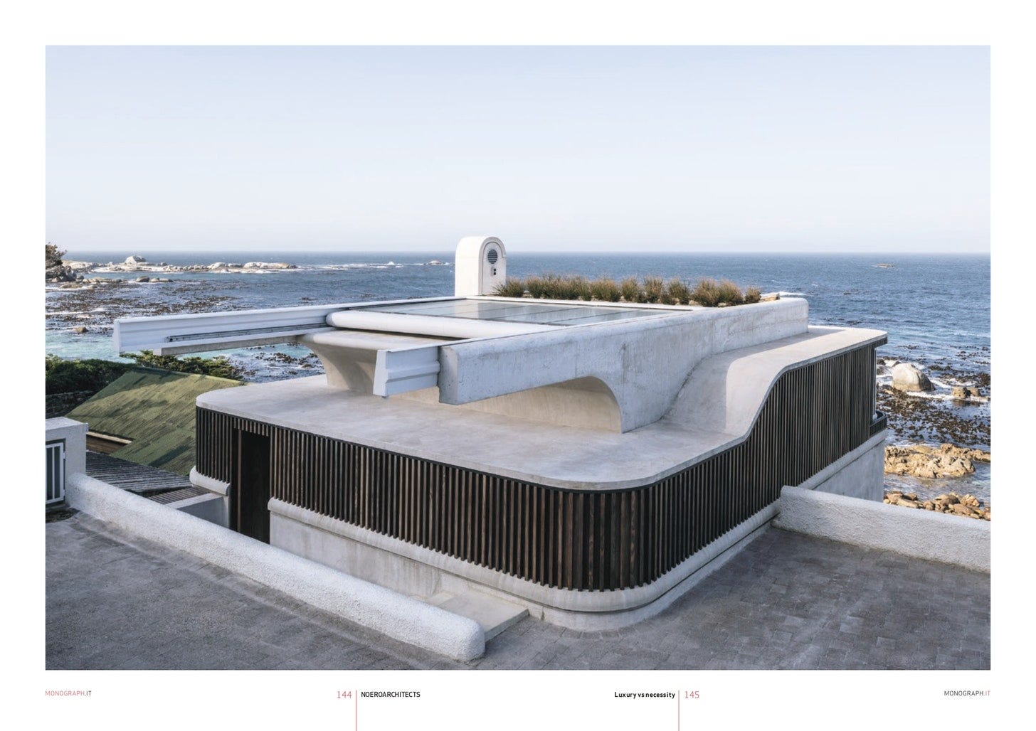 Housing occupies a privileged place in the book and in the philosophy of the studio, perhaps representing, more than anything else, the concretization of the necessity-luxury combination. Jo Noero's choice to question the colonial architectural style of South Africa, not to design housing units larger than 150 square meters, to privilege the use of poor and low-cost materials, represented a revolution in the way of conceiving housing architecture, allowing a deep connection between the concepts of function and expression. The houses of Noero Architects are based on the pillars of structural integrity, local material, integration with the landscape and the use and activities of people as a symbolic cultural value. An example is Castelrock House, a three-storey house with access from the back whose façade extends to "one of the most beautiful stretches of beach in the world": it is no coincidence that the color of the concrete was chosen so that it was as similar as possible to that of the sand. “A small house with a big program”, as it is defined in the book. The materials are designed to evolve over time into a layering of colors, showing signs of natural deterioration due to weather conditions, while the sliding glass roof part is designed to let sunlight in and ensure a view of the mountains.